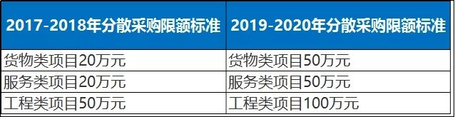 分散采购限额标准从50万元(含50万元)调整为100万元(含100万元)。