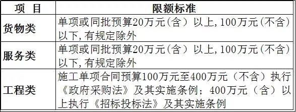 采购货物、服务和工程类项目限额标准为:货物、服务类项目单项或批量采购预算金额达到20万元(含20万元);工程类项目采购预算金额达到50万元(含50万元)。