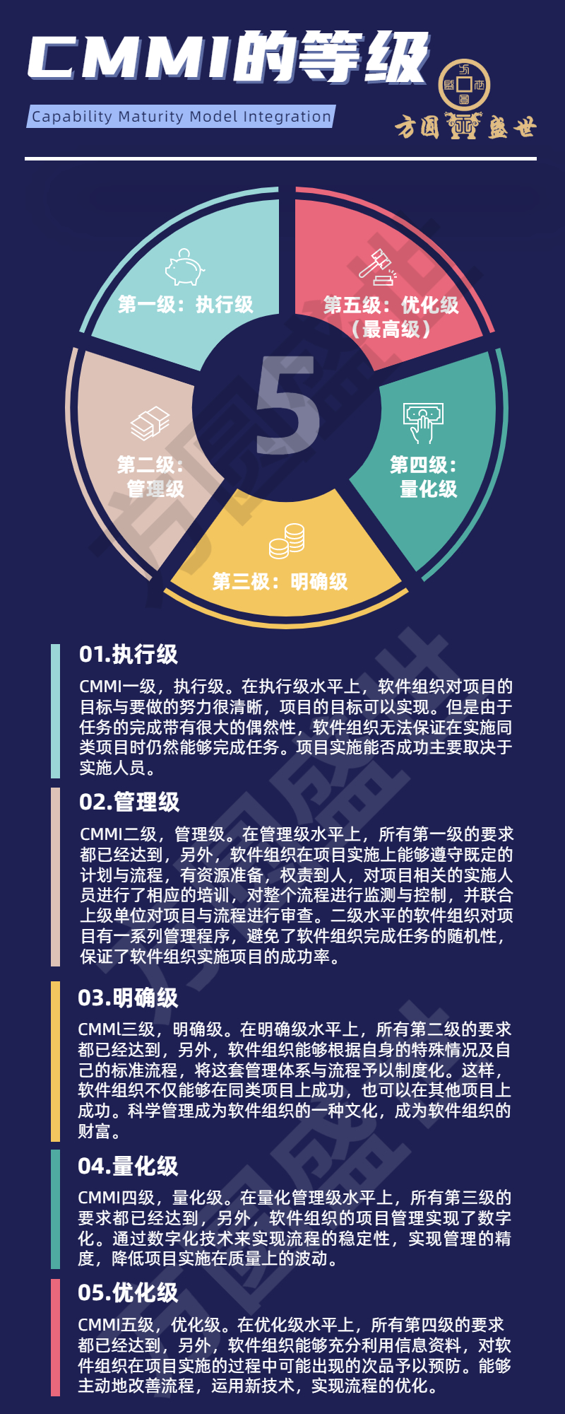 CMMI共有5个级别,代表软件团队能力成熟度的5个等级,数字越大,成熟度越高,高成熟度等级表示该企业有较强的软件综合开发能力。
