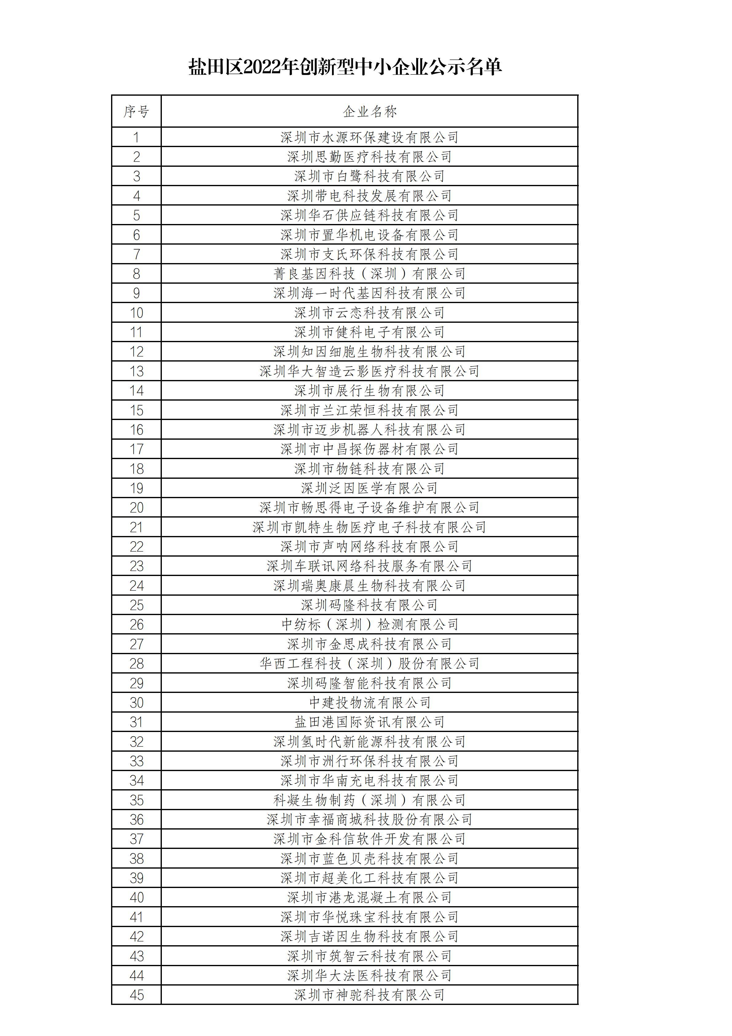 根据《深圳市工业和信息化局优质中小企业梯度培育管理实施细则》规定,我局组织开展了盐田区2022年创新型中小企业评价工作,经企业自评、佐证材料审核、抽查审计等程序,盐田区45家企业符合评价标准(名单附后),现予以公示,公示期:2022年12月1日-8日(共7天)。