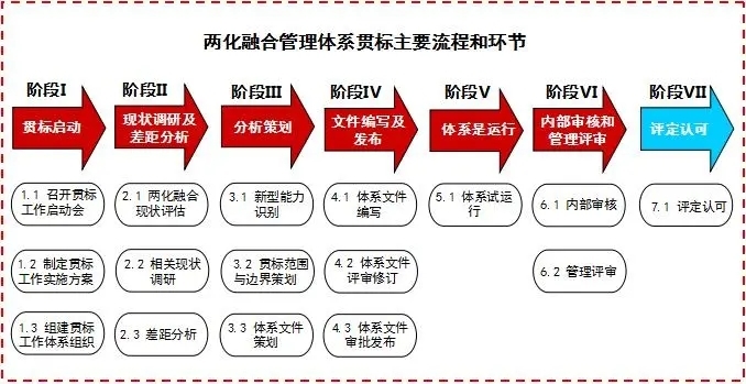 基本信息、贯标启动、现场调研与诊断、体系分析策划、文件编写与发布、体系试运行、内部审核与评审管理、满意度调查、评审申请等九个阶段。