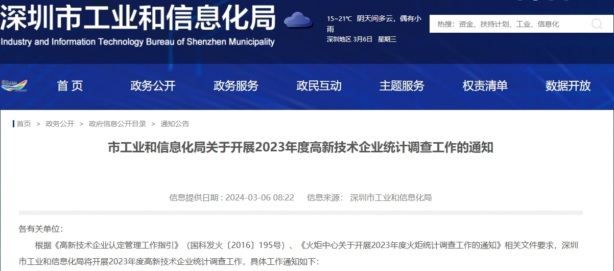 根据《高新技术企业认定管理工作指引》(国科发火〔2016〕195号)、《火炬中心关于开展2023年度火炬统计调查工作的通知》相关文件要求,深圳市工业和信息化局将开展2023年度高新技术企业统计调查工作,具体工作通知如下: