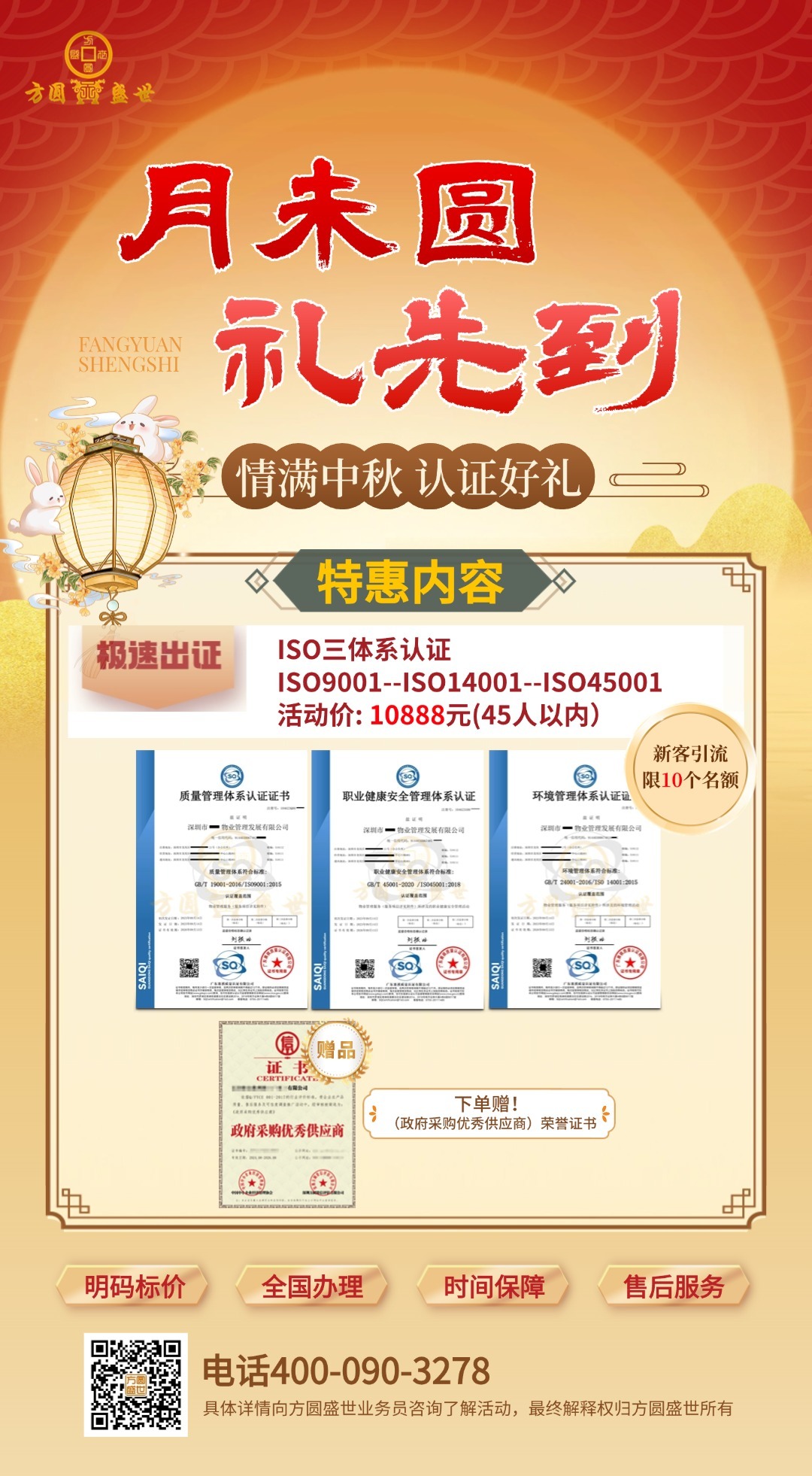 ISO三体系认证 10888元(45人内),三体系包含 (新客引流限10个名额)