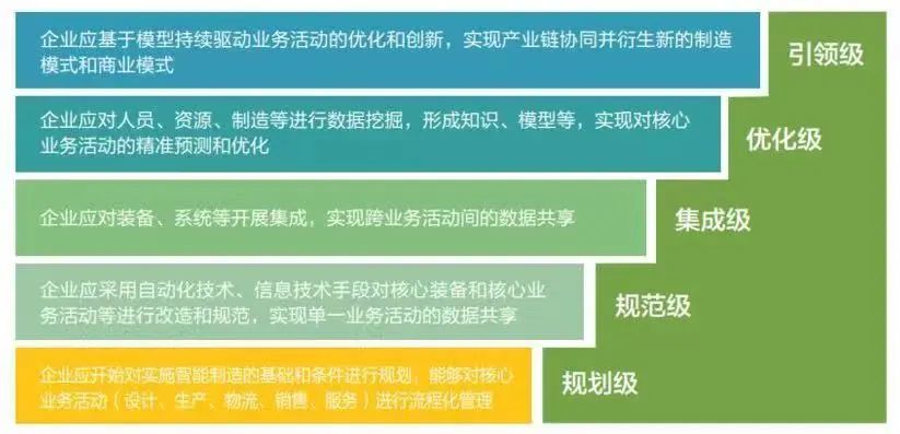 成熟度等级规定了智能制造在不同阶段应达到的水平。成熟度等级分为五级,自低向高即:一级(规划级)、二级(规范级)、三级(集成级)、四级(优化级)、五级(引领级)如图所示。较高的成熟度等级要求涵盖了低成熟度等级的要求。