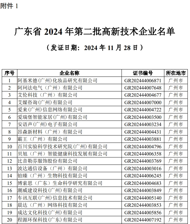 根据《科技部 财政部 国家税务总局关于修订印发〈高新技术企业认定管理办法〉的通知》(国科发火〔2016〕32号)和《科技部 财政部 国家税务总局关于修订印发〈高新技术企业认定管理工作指引〉的通知》(国科发火〔2016〕195号)有关规定,经企业申报,广东省高新技术企业认定管理工作领导小组办公室组织认定,并报全国高新技术企业认定管理工作领导小组办公室备案,2024年第二批4659家企业被认定为高新技术企业(名单见附件1)。请各有关单位做好高新技术企业证书发放工作,领取证书联系电话详见附件2。