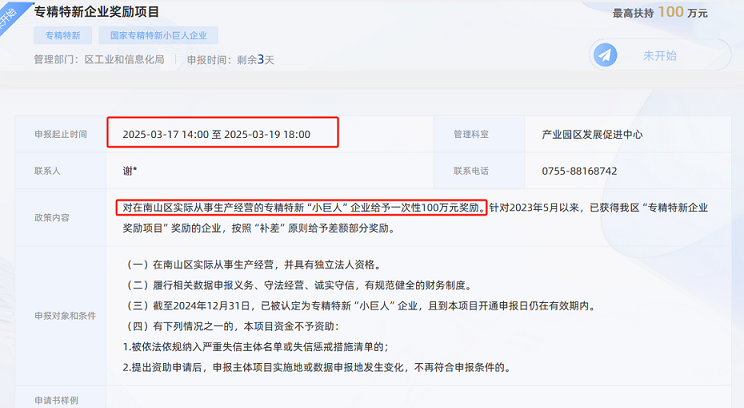 对在南山区实际从事生产经营的专精特新“小巨人”企业给予一次性100万元奖励。针对2023年5月以来,已获得我区“专精特新企业奖励项目”奖励的企业,按照“补差”原则给予差额部分奖励。