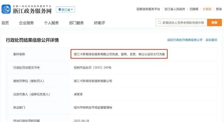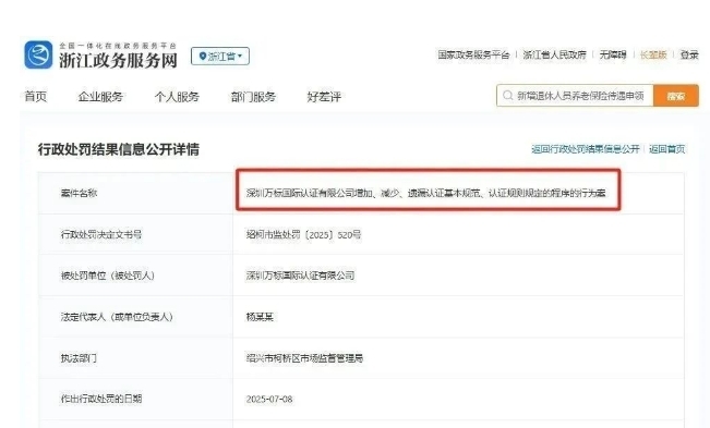 浙江省政务服务网一纸公示,让一桩认证行业的“隐秘交易”浮出水面。浙江卡斯顿保安服务有限公司在申请质量、环境、职业健康安全三大管理体系认证时,既无质量手册等体系文件支撑,也未与认证机构深圳万标国际签订合同,更无线下审核流程**。最终,涉事企业被罚3万元,成为国内认证监管中罕见的机构与企业“双罚”案例。