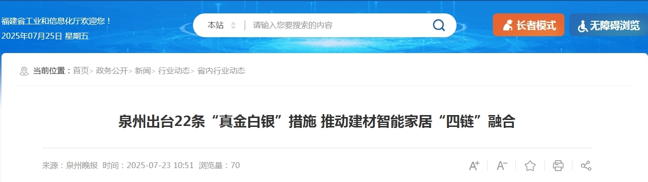 日前,泉州市工信局、市财政局联合出台《泉州市支持建材智能家居产业“四链”融合发展若干措施》(以下简称《措施》),从强化产业链的培优扶强和市场开拓、强化创新链对产业链的引领、强化资金链对产业链的保障、强化人才链对产业链的支撑等四方面入手,提出22条“真金白银”措施,以提升建材智能家居产业链韧性,激发创新动能,优化要素配置,推动创新链、产业链、资金链、人才链深度融合,打造先进产业集群。