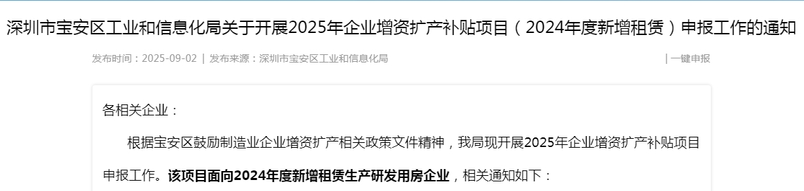 根据宝安区鼓励制造业企业增资扩产相关政策文件精神,我局现开展2025年企业增资扩产补贴项目申报工作。该项目面向2024年度新增租赁生产研发用房企业,相关通知如下: